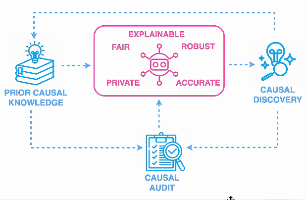 Figure 1. Causal Trustworthy ML Cycle: Causal ML can leverage existing knowledge and causal auditing to enhance different components of trustworthiness: explainability, fairness, privacy, and accuracy while simultaneously advancing understanding through causal discovery.